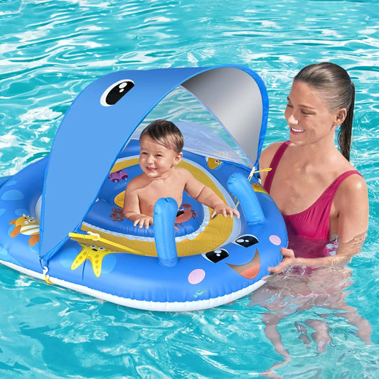 Baby Pool Float with Canopy UPF50+ Sun Protection, 6-24 Months Inflatable Infant Swimming Ring with Adjustable Safety Seat